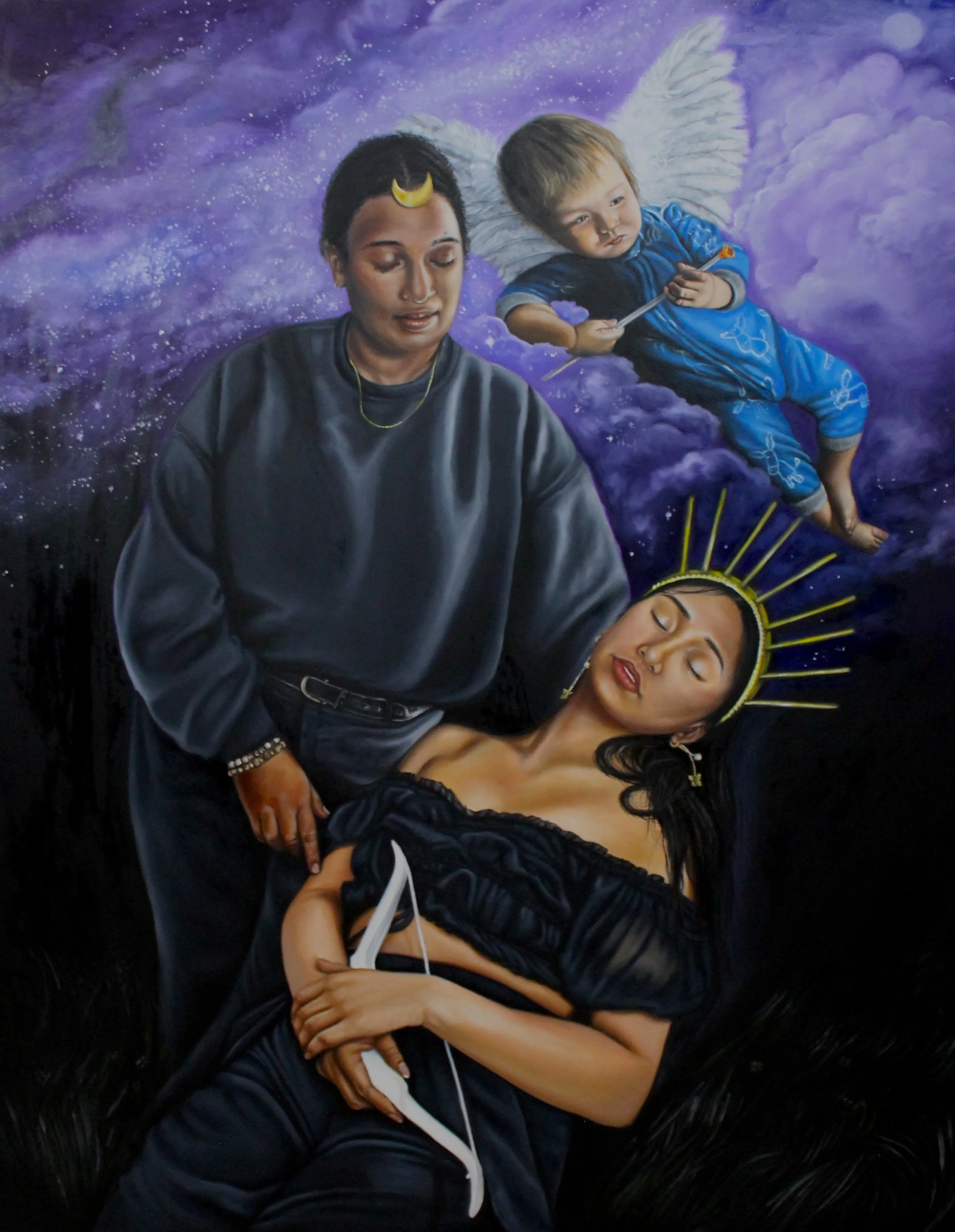 Selina, Adrianne, and Sparrow, as Selene, Endymion, and Cupid, oil on canvas, 48” x 60”, 2025